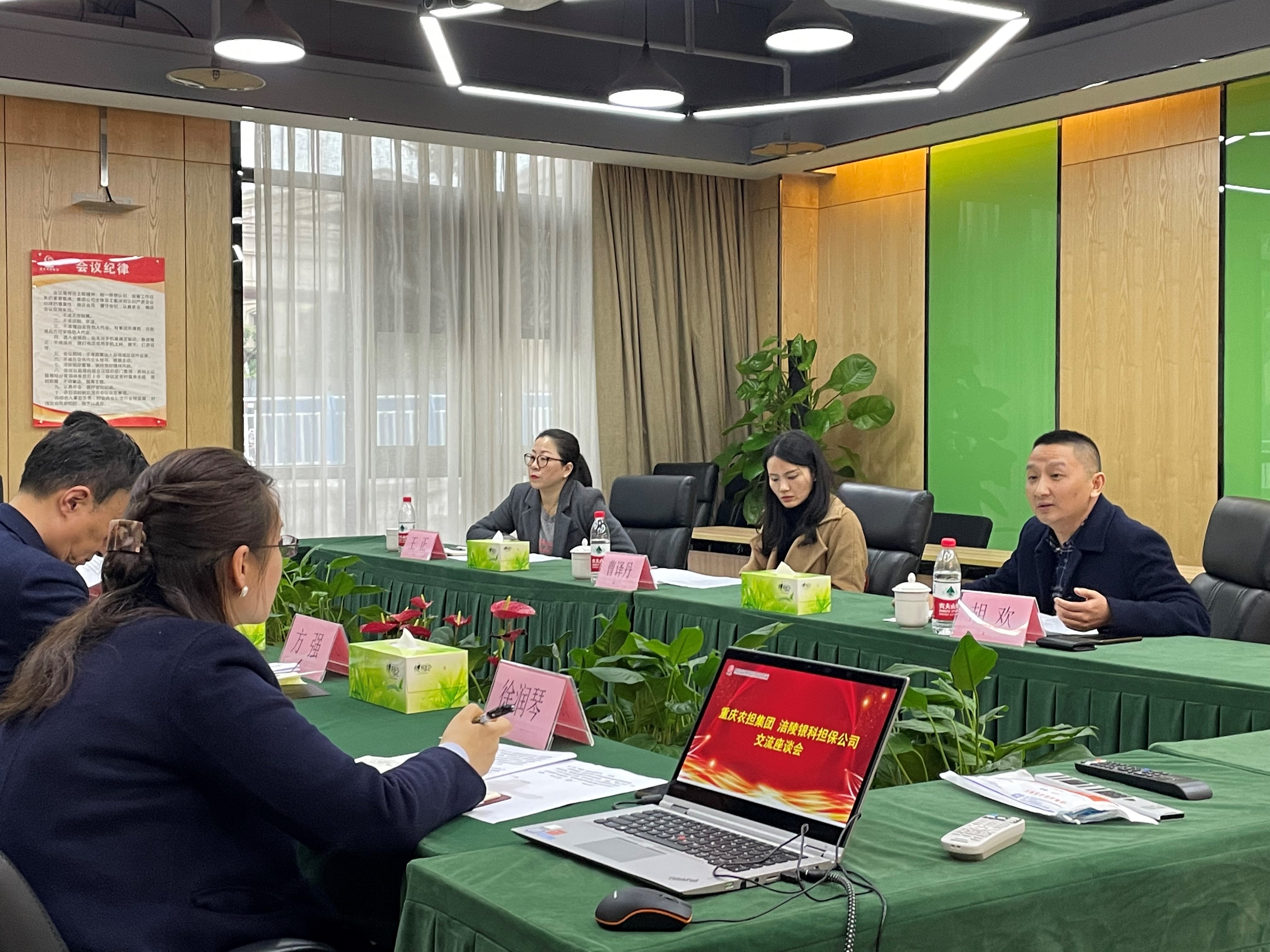 2021年12月14日,公司总经理曹译丹带队前往重庆市农业融资担保集团有限公司进行交流座谈。双方本着“整合资源、优势互补、协同发展”的合作原则,就未来的合作范围、合作模式、